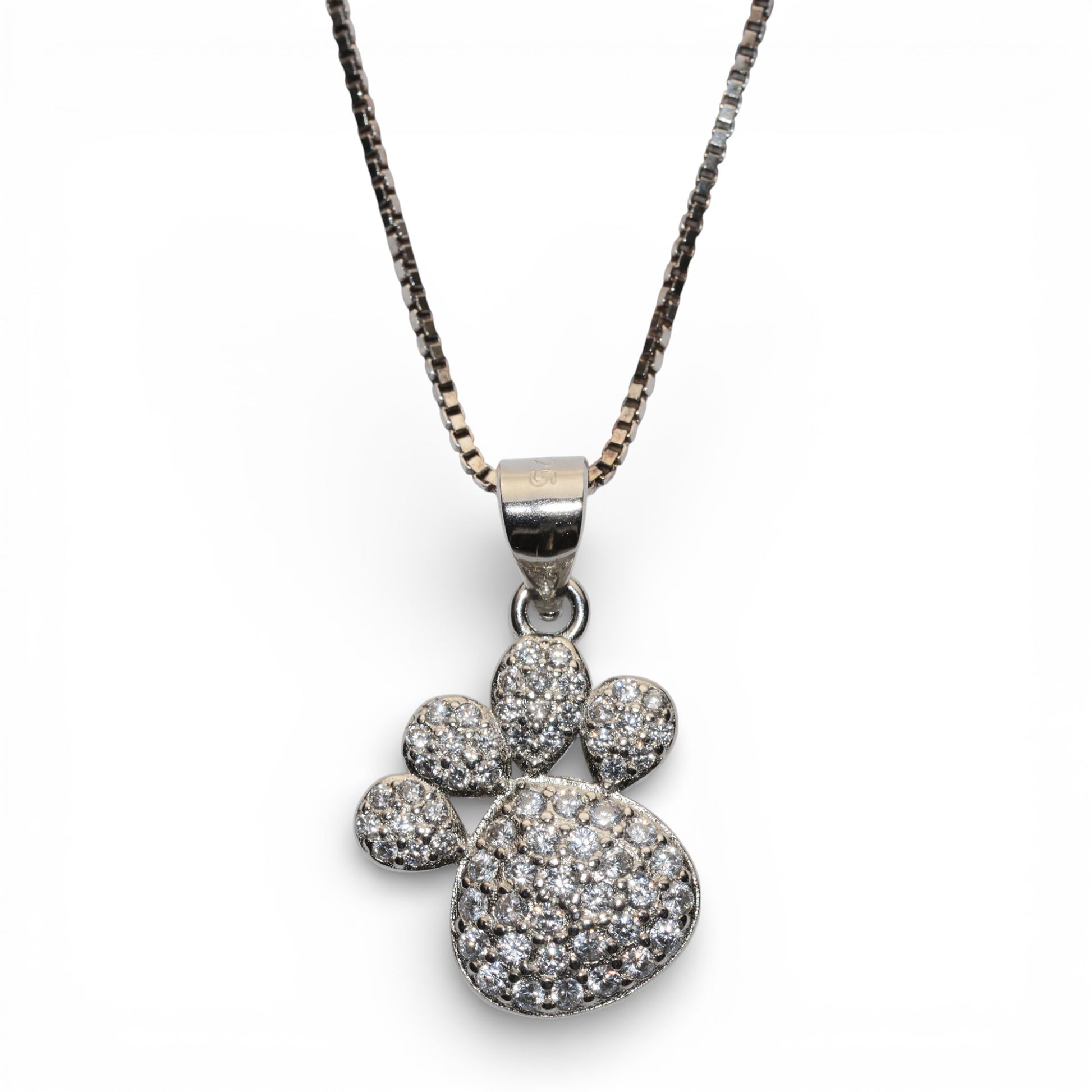 Catenina delicata in argento 925 rodiato con pendente a forma di impronta di cane, impreziosito da zirconi cubici che catturano la luce con eleganza. Un tributo raffinato all'amore incondizionato verso il tuo compagno a quattro zampe, perfetto per chi desidera portare con sé un ricordo prezioso.